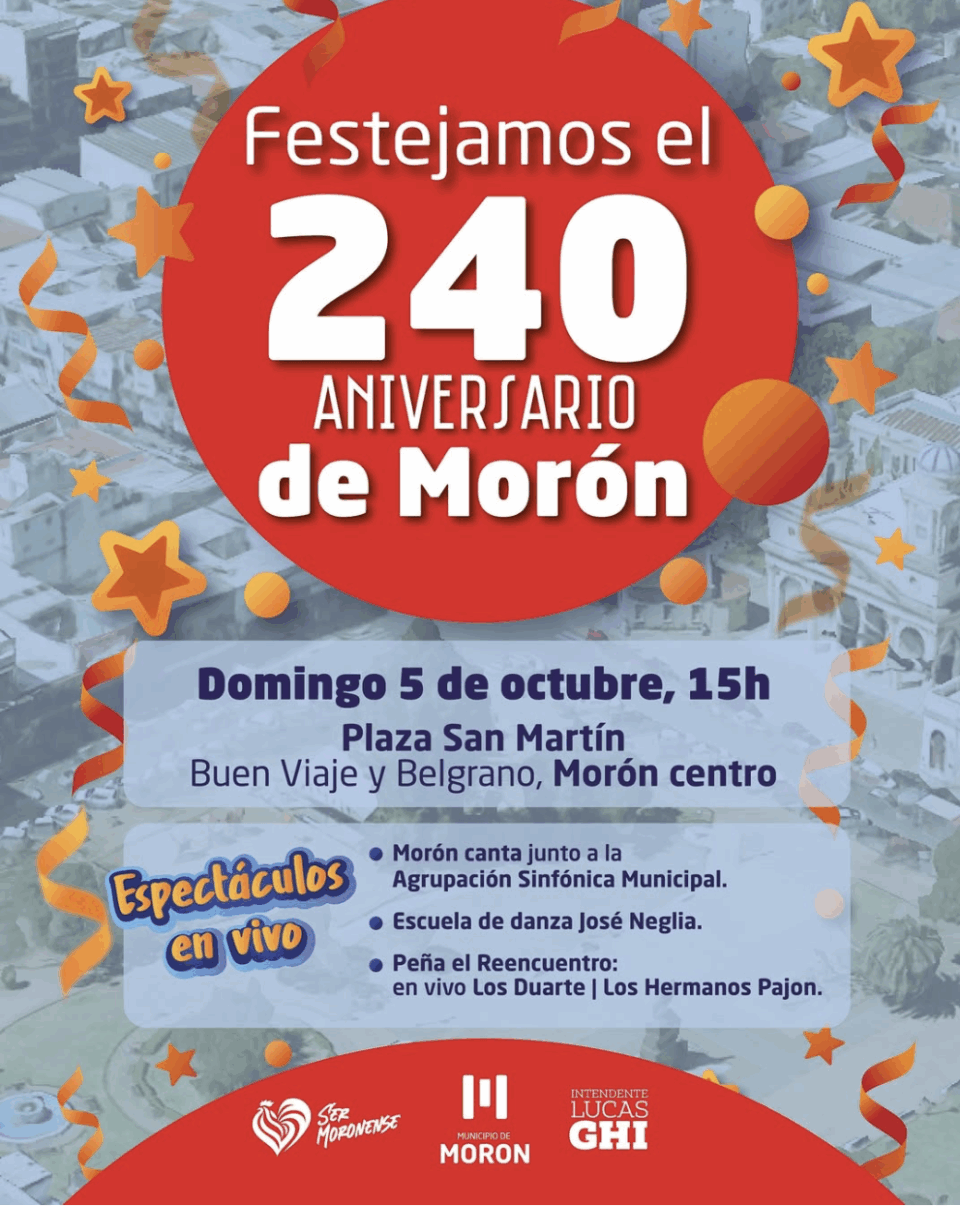 El Municipio de Morón invita a la comunidad a participar de los festejos por el 240º aniversario de la ciudad. El evento será el domingo 5 de octubre, desde las 15 hs, en la Plaza San Martín (Buen Viaje y Belgrano, Morón centro).