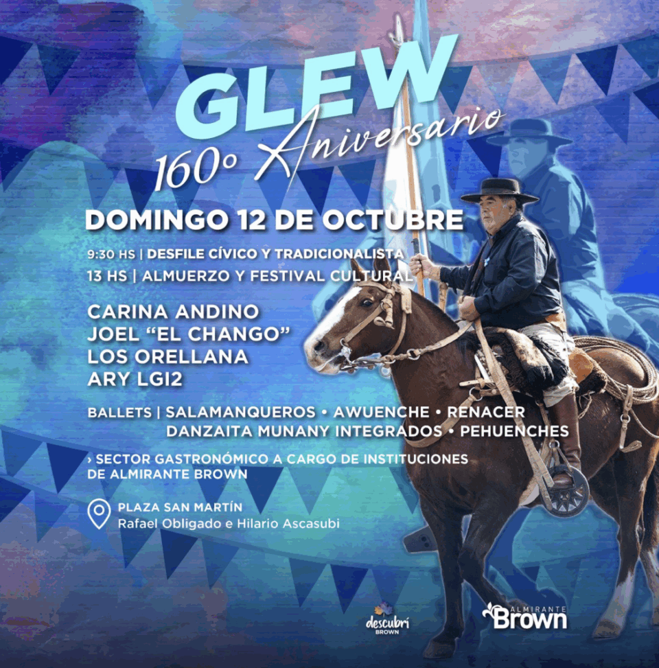 El aniversario de Glew se celebrará el domingo en la Plaza San Martín, ubicada en Rafael Obligado y Hilario Ascasubi, donde desde las 10 de la mañana y hasta entrada la noche habrá un desfile cívico y tradicionalista, un almuerzo popular y un Festival Cultural con shows de música y danza.