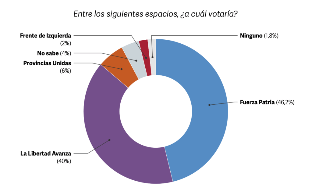 Según el relevamiento nacional, Fuerza Patria (el frente peronista) alcanza un 46,2% de intención de voto en todo el país, mientras que La Libertad Avanza se ubica en 40%, con una pendiente descendente semana a semana.