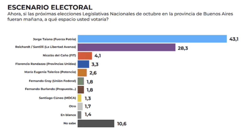 Una reciente medición de la consultora Nueva Comunicación —la misma que más se acercó al resultado bonaerense en la elección anterior— muestra una ventaja de casi 15 puntos para Fuerza Patria sobre La Libertad Avanza.