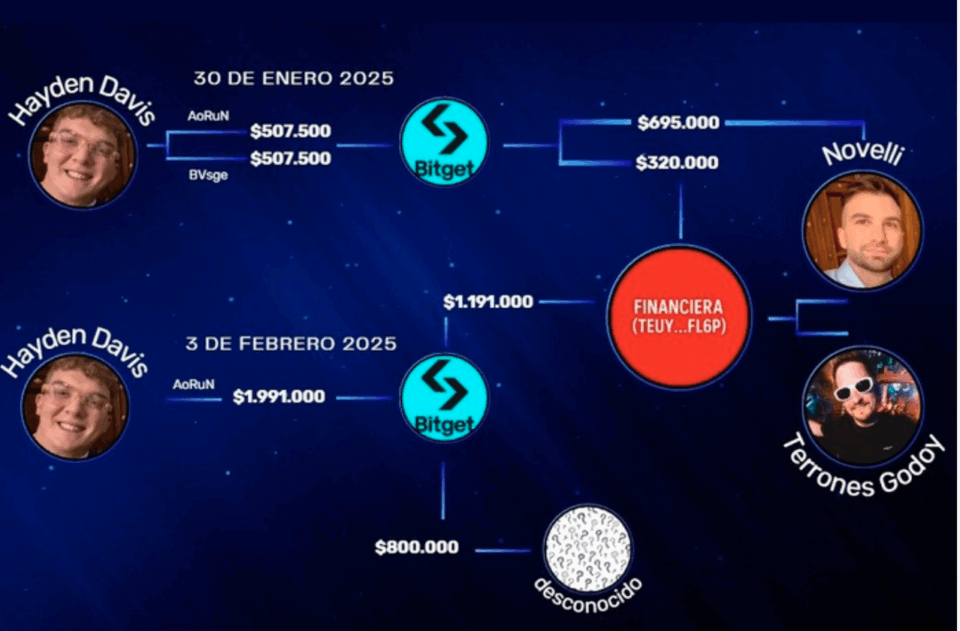El hallazgo surgió a partir del análisis de transacciones en la blockchain, cruzadas con información provista por Binance, que reveló movimientos financieros vinculados a una billetera a nombre de Novelli y su socio Terrones Godoy, ambos responsables del Tech Forum Argentina, el evento realizado en octubre de 2024 donde confluyeron todos los actores del proyecto $LIBRA —entre ellos Davis, Julian Peh y el propio presidente Milei—.