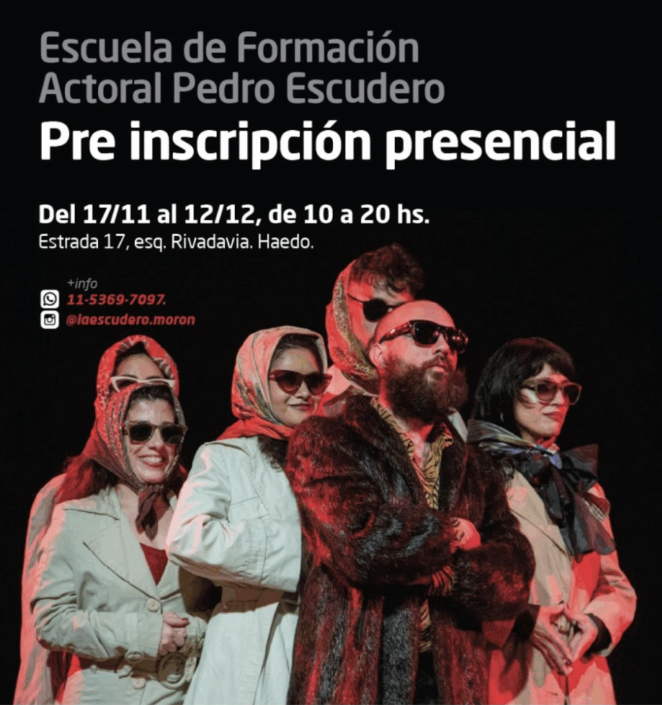 El Municipio de Morón informa que del 17 de noviembre al 12 de diciembre, de 10 a 20 hs, abrirá la preinscripción presencial para ingresar a la Escuela de Formación Actoral Pedro Escudero. Las y los interesados podrán acercarse al edificio ubicado en Estrada 17, esquina Rivadavia, Haedo. Para más información, pueden comunicarse al 11-5369-7097.