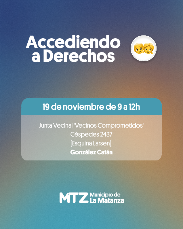 La nueva propuesta de Accediendo a Derechos se llevará a cabo este miércoles 19 de noviembre, en la junta vecinal Vecinos Comprometidos, ubicada en Céspedes 2437, esquina Larsen, de la localidad de González Catán, de 9 a 12 horas.