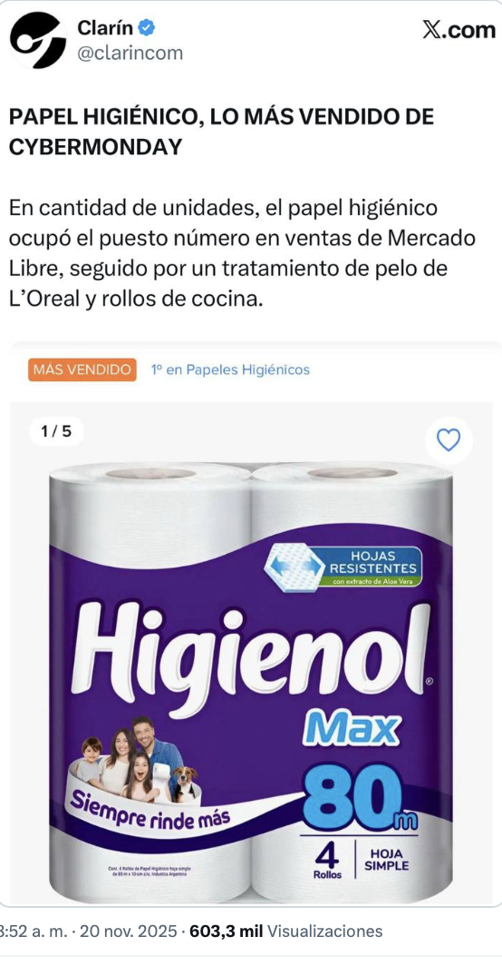 P/D 2: Mientras tanto y para medir la temperatura de la economía y el consumo de los argentinos: el papel higiénico fue lo más vendido en el Cyber Monday… Sí, así como lo leés… Puesto número uno en compras de Mercado Libre. Pensar que en el 2015, a esta altura del año, los argentinos compraban equipos de aire acondicionado o planificaban sus vacaciones… Lo dicho: si no hay pan, que haya circo… O papel higiénico.