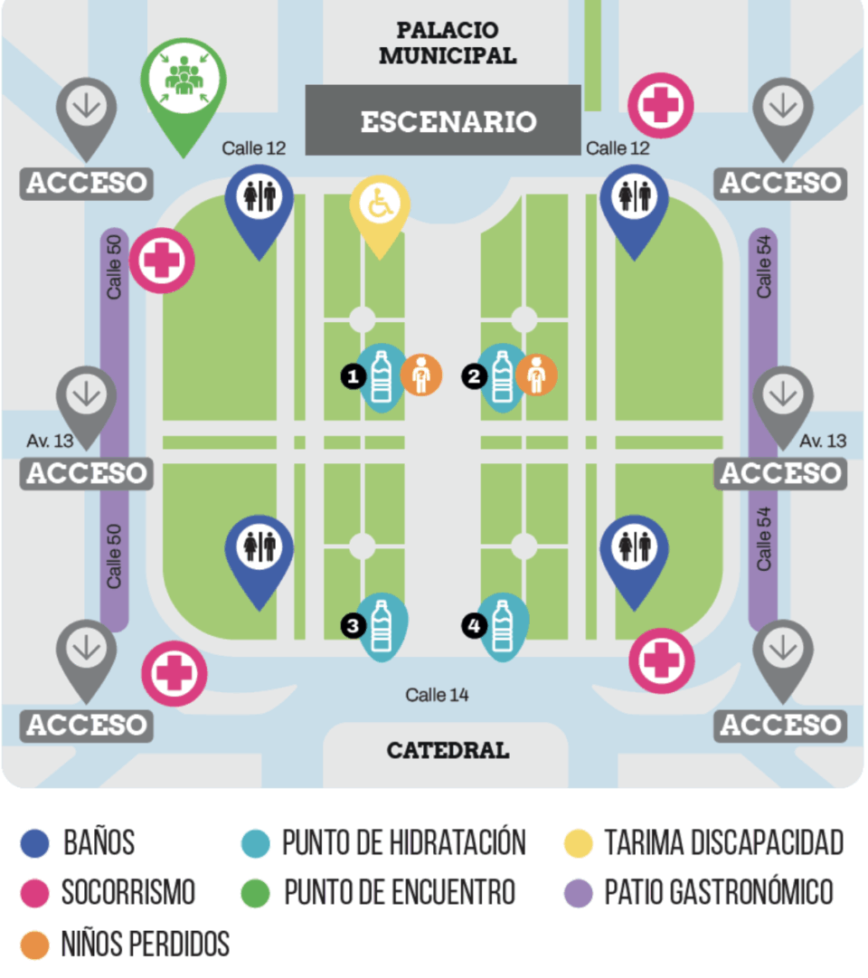 El escenario principal de la celebración estará montado sobre calle 12 entre 51 y 53, para facilitar el movimiento del público se dispondrán cortes en el perímetro de la plaza y los accesos estarán ubicados sobre diagonal 73 y 54, 13 y 54, diagonal 74 y 14, diagonal 74 y 50, 13 y 50, y diagonal 73 y 14.