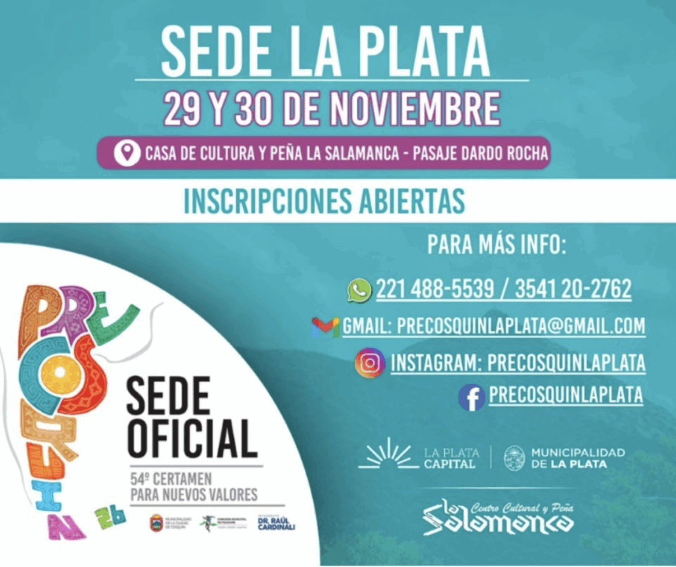Según se indicó desde el espacio de difusión y promoción de la competencia Casa de Cultura y Peña La Salamanca, las personas interesadas deben enviar un correo a precosquinlaplata@gmail.com, consignando sus datos personales y los requisitos obligatorios que se solicitan. Para consultas, pueden comunicarse al 221 488 5539.