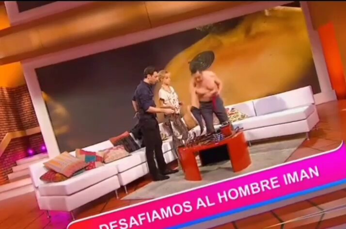Angel Cabral año 2014 antes del COVID con Mariana FABIANI buscaba aparecer en el libro Guinness de los récords pegándose cosas al cuerpo con la grasa de su piel