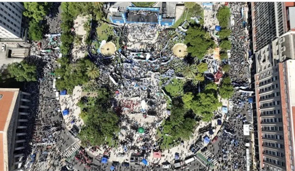 Luego de la masiva movilización de trabajadores en Plaza de Mayo, el dirigente de la CGT Jorge Sola, del Sindicato del Seguro y uno de los triunviros de la nueva conducción, fue contundente: “Es el primer paso de un plan de lucha. Si siguen sin escucharnos los que están acá atrás”, dijo en referencia a la Casa Rosada, “terminaremos en un paro nacional”. Luego agregó: “No hay libertad sin justicia social, le pese a quien le pese”.