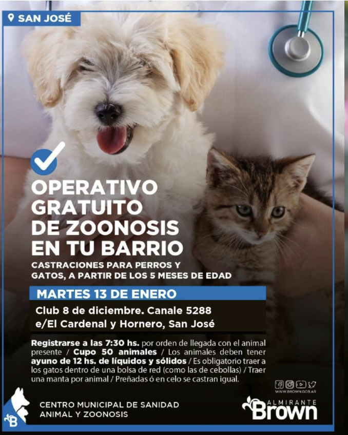 “Estamos muy felices de anunciar que seguimos sumando servicios en barrios y localidades de Almirante Brown con operativos itinerantes de castración, vacunación y observación antirrábica, en el marco de nuestro programa de castraciones gratuitas, masivas, sistemáticas, tempranas y abarcativas que es modelo en el país “, señaló Mariano Cascallares.