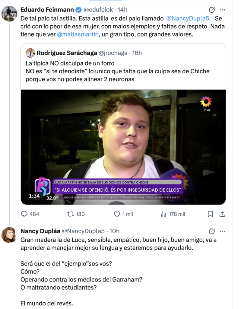 Lejos de esquivar la polémica, Dupláa respondió con un mensaje directo y contundente en redes sociales, defendiendo a su hijo y cuestionando con dureza el rol público de Feinmann. En un tuit que rápidamente se viralizó, escribió: “Gran madera la de Luca: sensible, empático, buen hijo, buen amigo. Va a aprender a manejar mejor su lengua y estaremos para ayudarlo. ¿Será que el del ‘ejemplo’ sos vos? ¿Cómo? ¿Operando contra los médicos del Garrahan? ¿O maltratando estudiantes? El mundo del revés”.