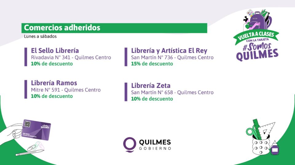 El Municipio de Quilmes informa que con motivo del inicio del ciclo lectivo 2026, los usuarios de la tarjeta de beneficios Somos Quilmes podrán obtener importantes descuentos, de entre el 10% y 30%, en librerías y locales de venta de artículos escolares del distrito, realizando su compra entre el 23 de febrero y el 31 de marzo, y así acceder a útiles y elementos necesarios para que las y los alumnos puedan comenzar las clases con todo lo necesario para poder estudiar.