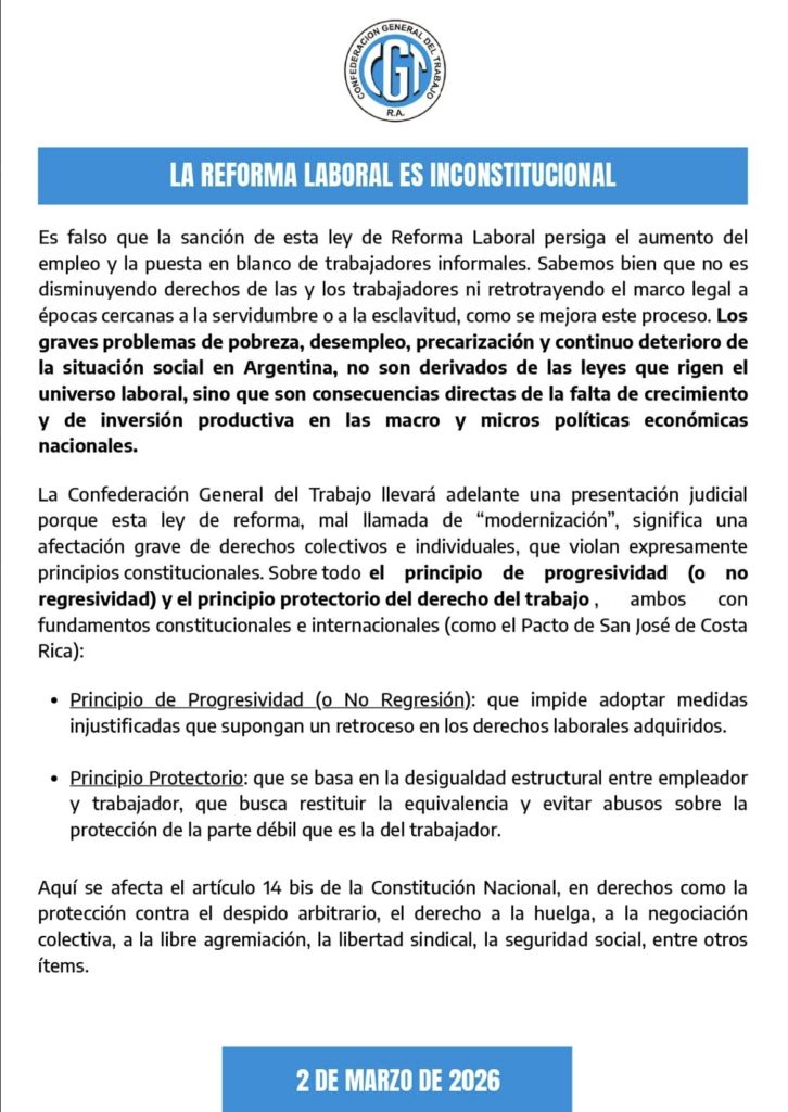 En el documento, la CGT hace eje en la presunta inconstitucionalidad de la ley. Señala que vulnera el principio de progresividad de los derechos sociales —que impide retrocesos en materia de protección laboral— y el principio protectorio que rige el derecho del trabajo.