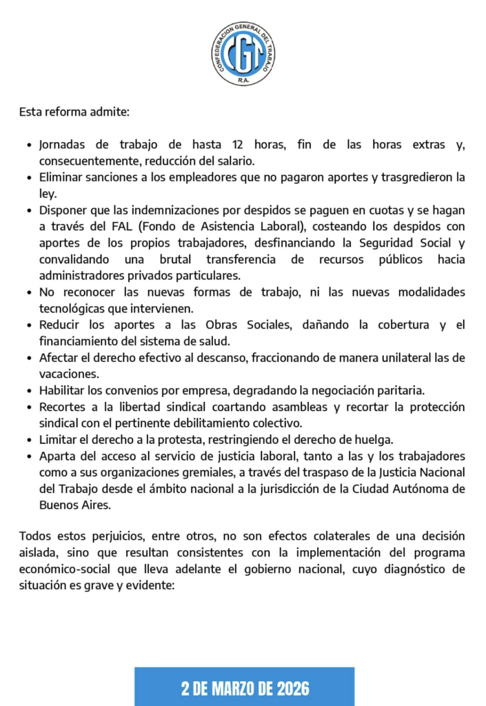 La central sindical sostiene que la reforma forma parte de un programa económico más amplio que, lejos de generar empleo, profundiza la caída de la actividad y debilita el poder adquisitivo.
