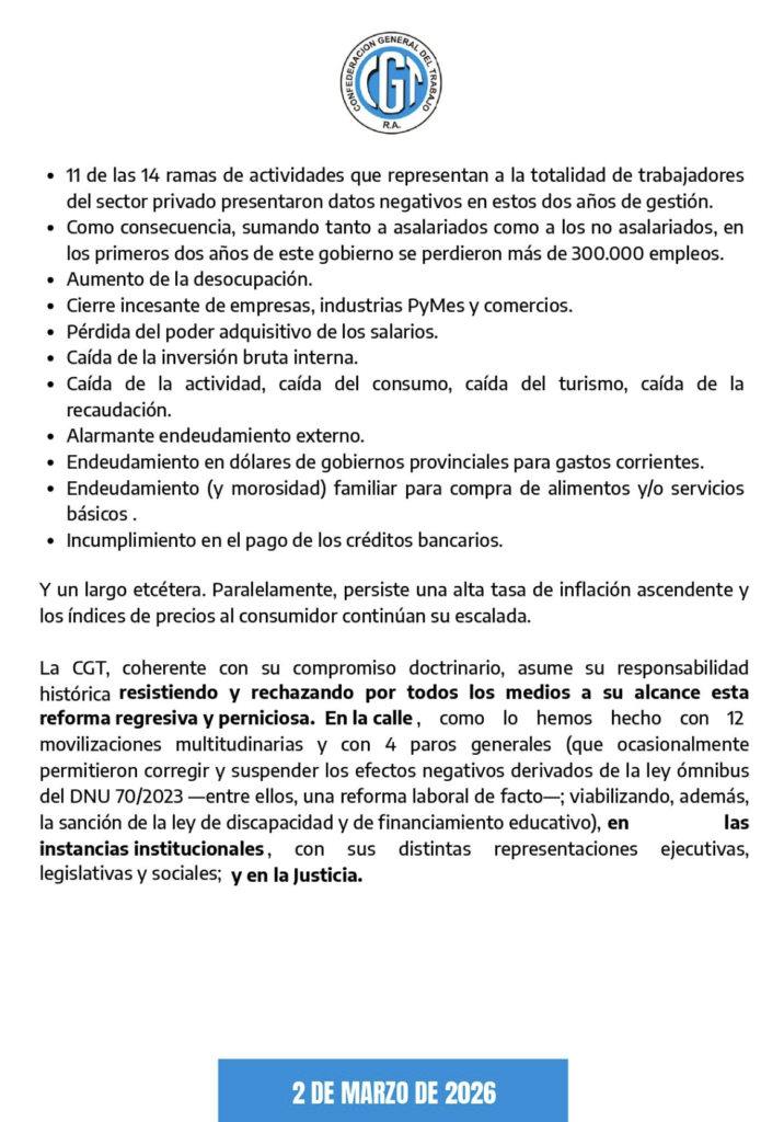 Según el texto difundido, los problemas de pobreza, desempleo y trabajo informal no se originan en el marco normativo vigente, sino en la falta de crecimiento sostenido, inversión productiva y políticas de desarrollo. Para la CGT, el deterioro social responde a decisiones macro y microeconómicas adoptadas en los últimos años y no a un supuesto “exceso de derechos laborales”.