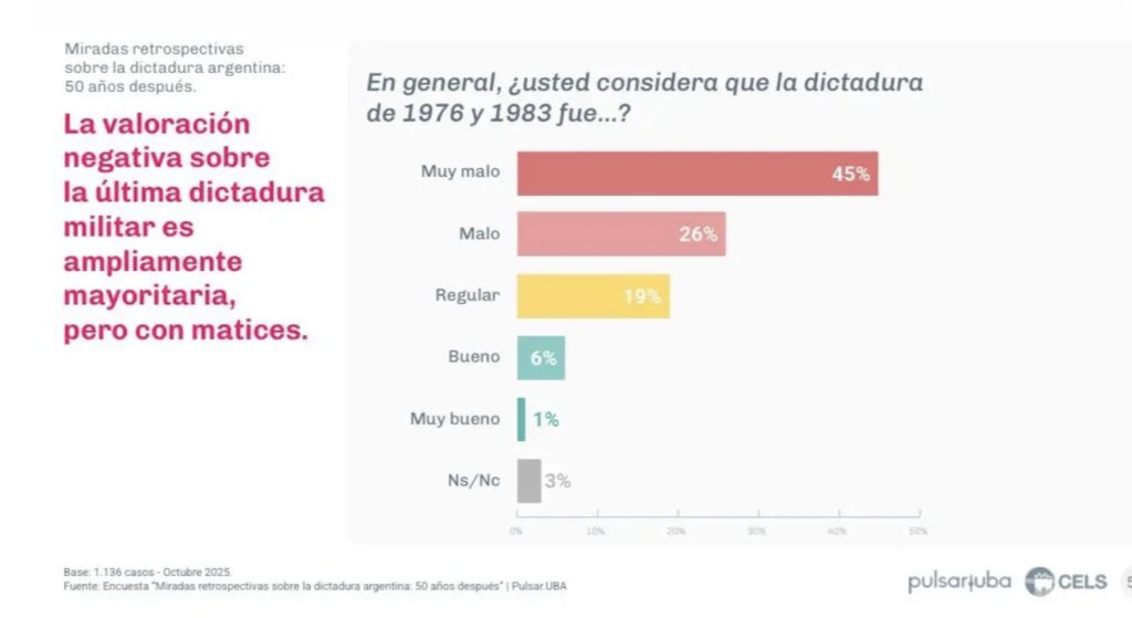 El estudio, titulado “Miradas retrospectivas sobre la dictadura argentina: 50 años después”, se elaboró a partir de una encuesta realizada en octubre de 2025 sobre una muestra de 1.136 personas en todo el país.