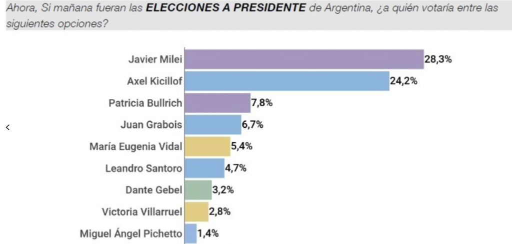 Más atrás aparecen figuras como María Eugenia Vidal (5,4%), Victoria Villarruel (2,8%) y el pastor evangélico Dante Gebel (3,2%), en un escenario político cada vez más fragmentado.