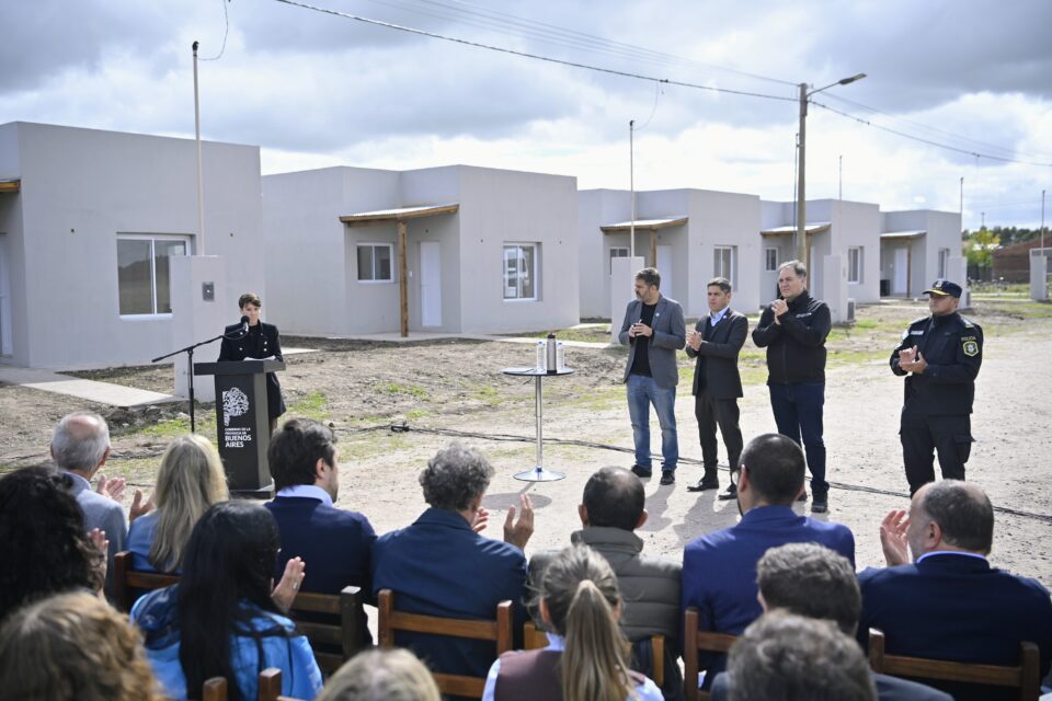 El gobernador de la provincia de Buenos Aires, Axel Kicillof, encabezó este miércoles el acto de entrega de viviendas destinadas a personal policial de la localidad de De la Garma, municipio de Adolfo Gonzales Chaves, donde además puso en funcionamiento una ambulancia de alta complejidad y una combi para transporte escolar. Fue junto a los ministros de Seguridad, Javier Alonso, y de Salud, Nicolás Kreplak; y la intendenta local, Lucía Gómez.