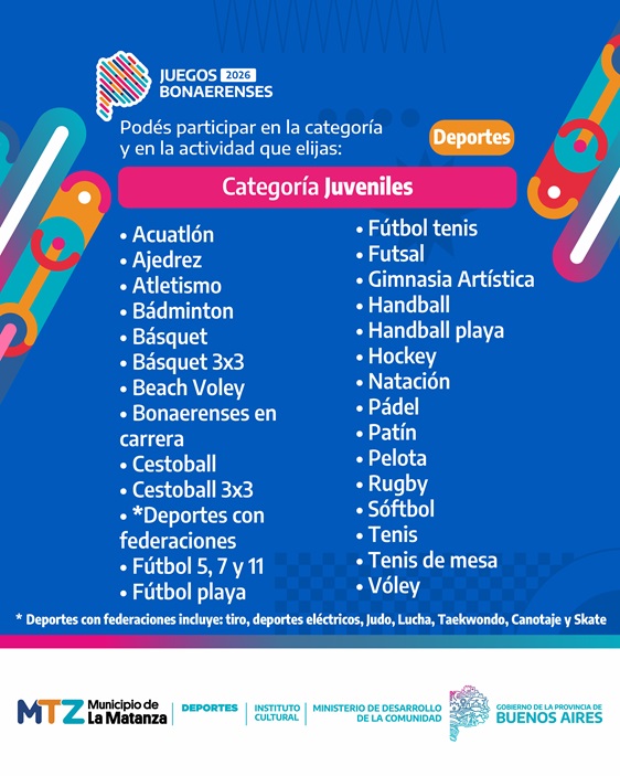 La inscripción se realiza a través de la web oficial de los Juegos Bonaerenses: juegos.gba.gob.ar, donde también se encuentra disponible el listado completo de disciplinas y reglamentos.